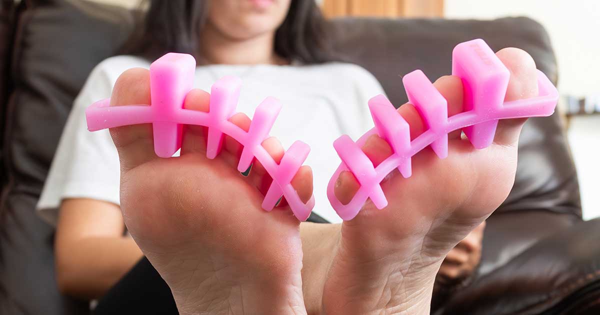 Step 1: Gently and gradually slide the Tuli's Soft Moves Adjustable Toe Separator between your toes, starting with a minimal and comfortable separation.